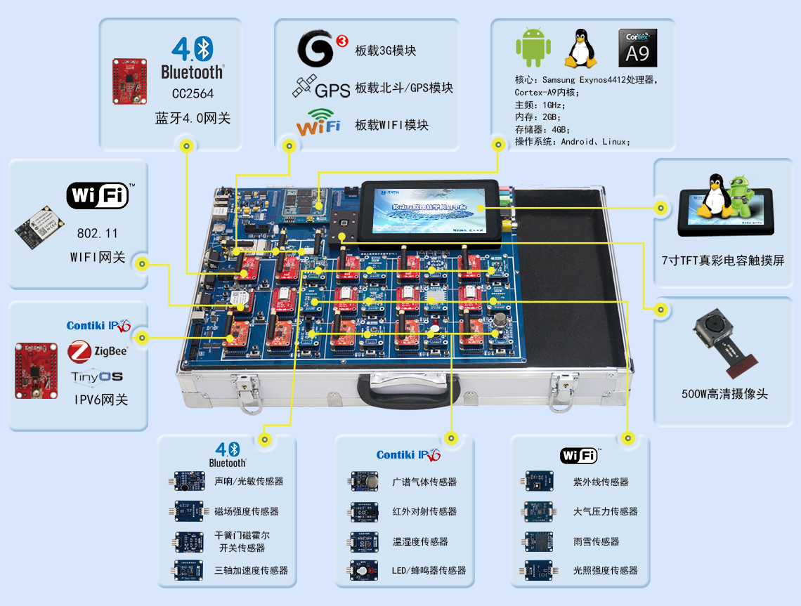 本期培訓課程內容是針對高校移動互聯、物聯網教學量身定制的,涵蓋了物聯網應用服務層、感知和傳輸層知識體系等內容,其中包括Android系統移植、Android驅動開發、Android應用開發以及Zigbee無線傳感網絡、藍牙無線傳感網絡、wifi無線傳感網絡、基于IPV6協議的無線傳感網絡、3G、GPS等技術。課程結合移動互聯網教學科研平臺II型,實踐感知理論,案例生動豐富,力求使學員能夠在短時間內掌握物聯網的基本知識,移動互聯網Android應用開發的基本技能,學會利用移動互聯、物聯網技術開發Android項目,提高實踐指導能力。